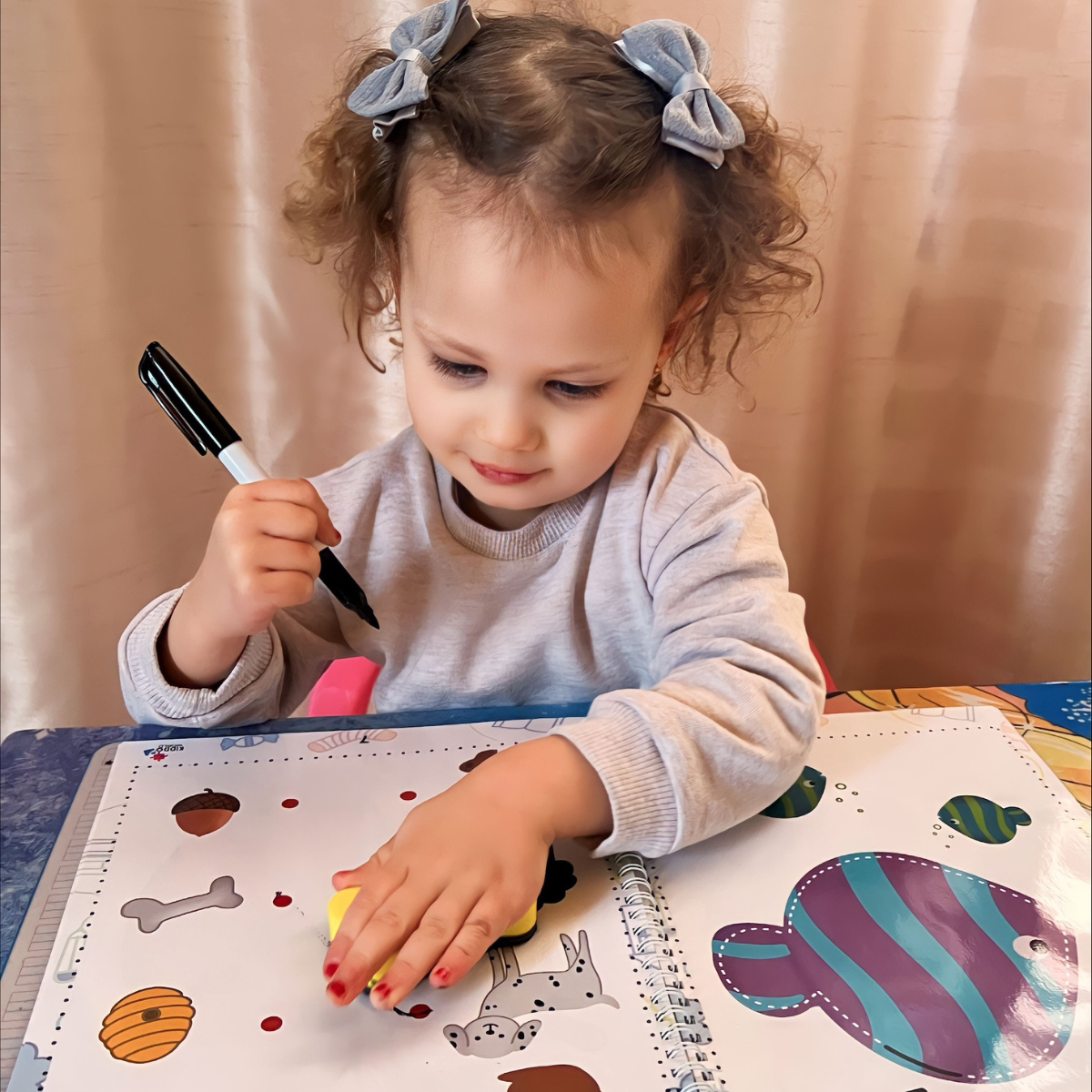 Díky úkolům pro sledování čar děti aktivně propojují obrázky, pojmy a slova, rozpoznávají a pojmenovávají zvířata i předměty. Součástí jsou dva fixy a houbička pro snadné mazání a opakování úkolů.