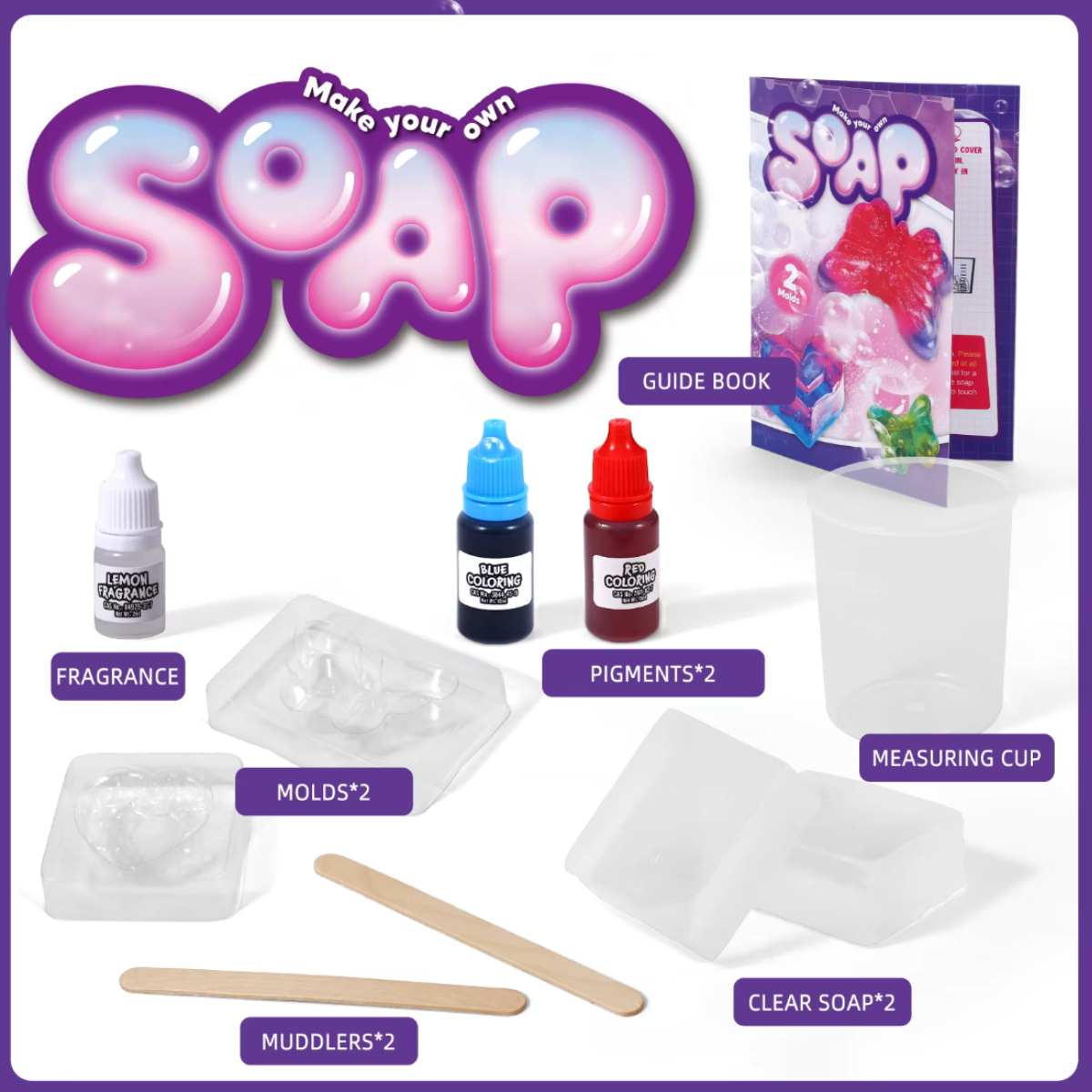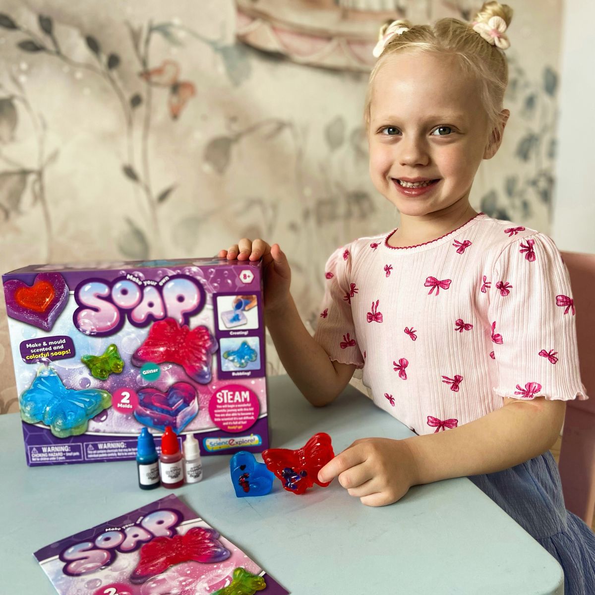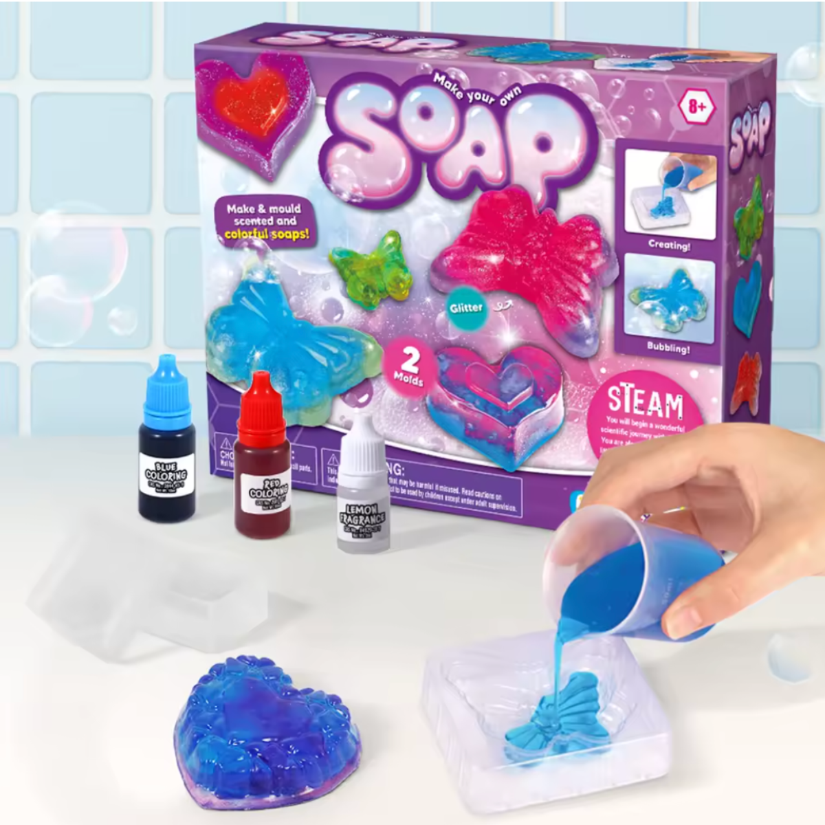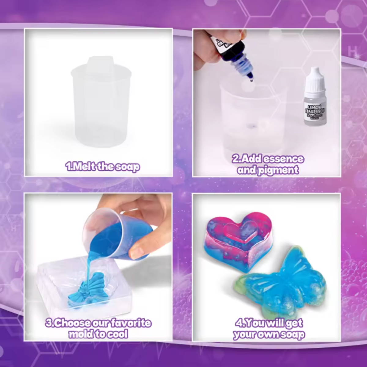 Nechte svého malého tvůrce vytvořit si vlastní kouzelná mýdla! 🧼✨ Tato kreativní sada obsahuje vše, co děti potřebují k výrobě voňavých, barevných mýdel: formičky ve tvaru motýlka a srdíčka, přírodní barviva, mýdlovou hmotu, vůně, kelímek na míchání, dřevěnou špachtli a podrobný návod pro snadné použití.