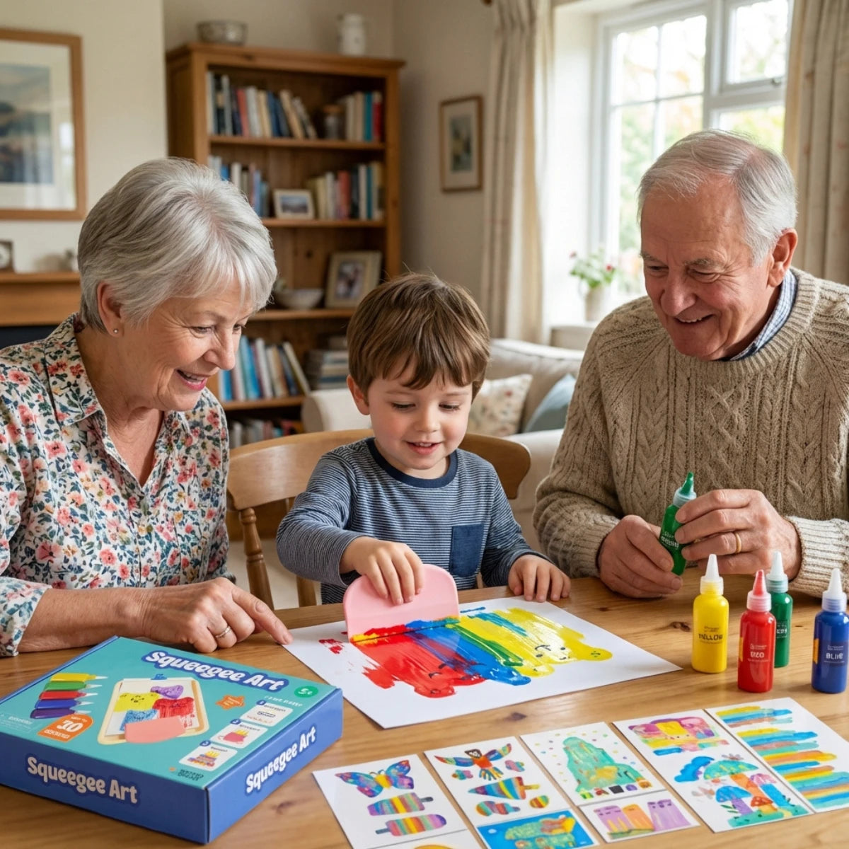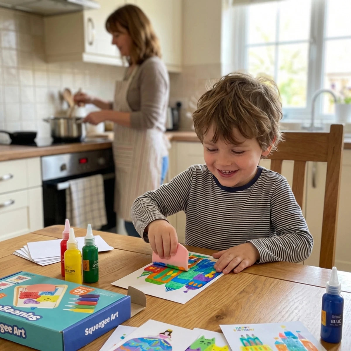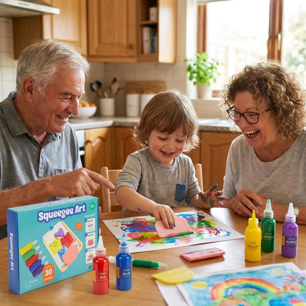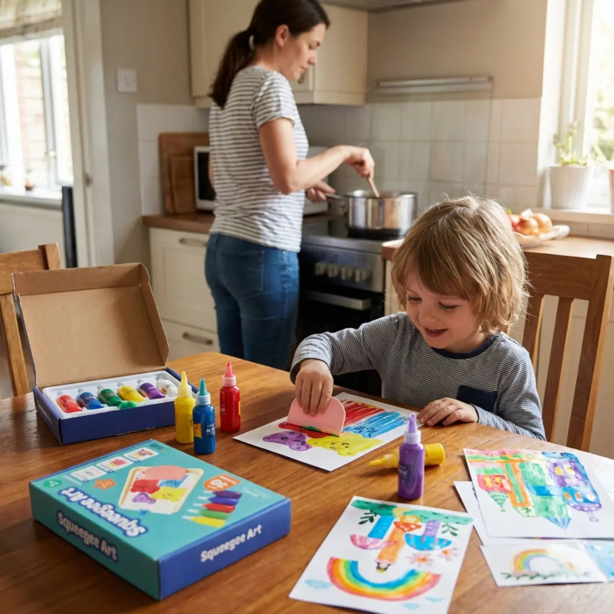 Nechte dětskou kreativitu rozvinout do nádherných duhových uměleckých děl. Squeegee Art Kit s magickou stěrkou umožňuje dětem zkoumat míchání barev, textury a vzory bez štětců. Každý tah stěrkou vytváří jedinečný výsledek, což posiluje dětské sebevědomí a smysl pro estetiku. Sada obsahuje speciální protiskluzovou podložku, která během tvoření pevně drží papír na místě, což dítěti umožňuje nerušené malování. Rozvojová hračka, která podporuje soustředění, posiluje jemnou motoriku a nabízí čistou, bezpečnou hru bez obrazovek, kde je každé dítě okamžitým umělcem.
