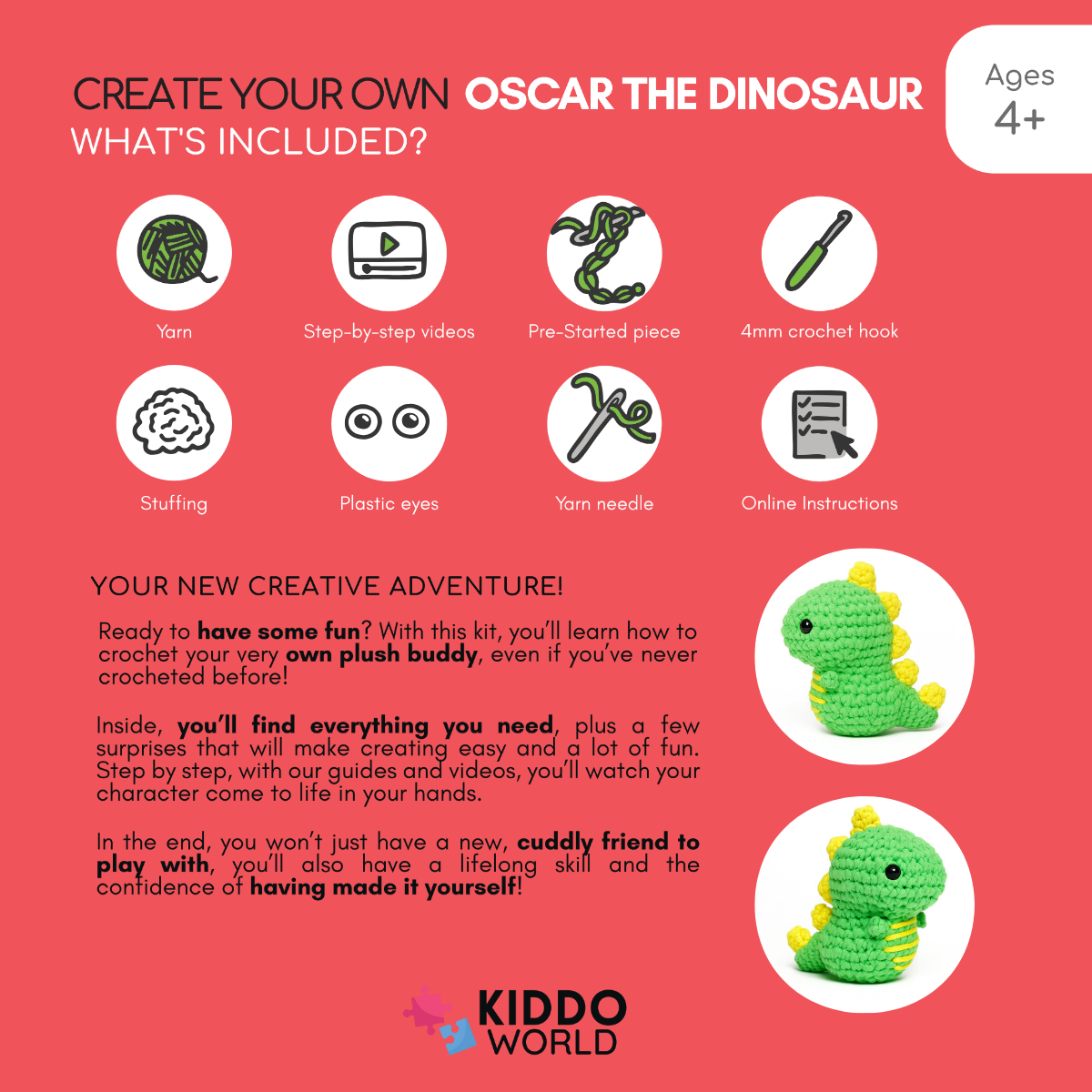 👉 Učení háčkování je s touto sadou snadné, zábavné a bez frustrací. ✨ Užij si každý krok a sleduj, jak tvůj dinosaurus Oscar ožívá pod tvýma rukama! 🦖